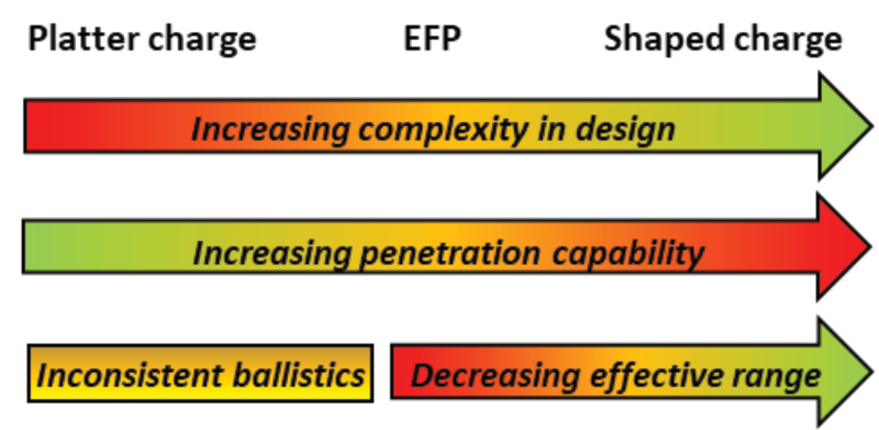 - Also referred to as explosively formed projectiles, explosively forged projectiles and explosively forged penetrators. In an EFP IED, the enhancement is added in the form of a dish, precisely shaped from ductile metal. When the IED is initiated, explosive forces bend the dish causing it to invert. This forms a smaller more aerodynamically stable cross-sectional area penetrator that is projected towards the target at very high velocity. Depending on their design, these projectiles are capable of penetrating substantial armour at distances even beyond 10 m or so.